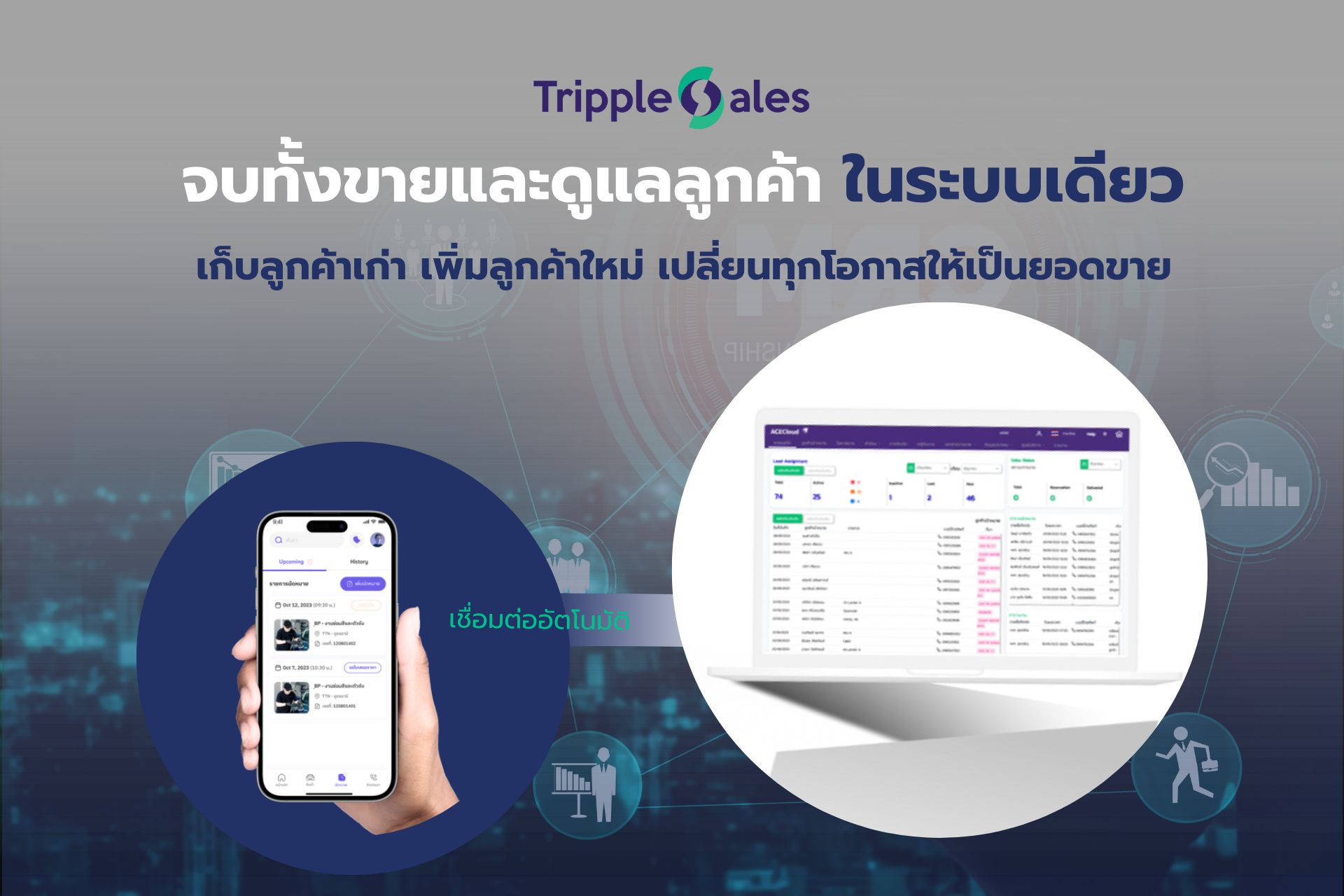 Triple Sale CRM คือระบบ CRM แบบ All-in-One ที่ออกแบบมาเพื่อขับเคลื่อนยอดขายให้กับธุรกิจยุคใหม่ โดยเน้นการเชื่อมต่อทุกฝ่ายในองค์กรอย่างราบรื่น ตั้งแต่การจัดการ Leads, การนัดหมาย, บริการหลังการขาย ไปจนถึงการดูสต็อกและรายงาน Real-Time